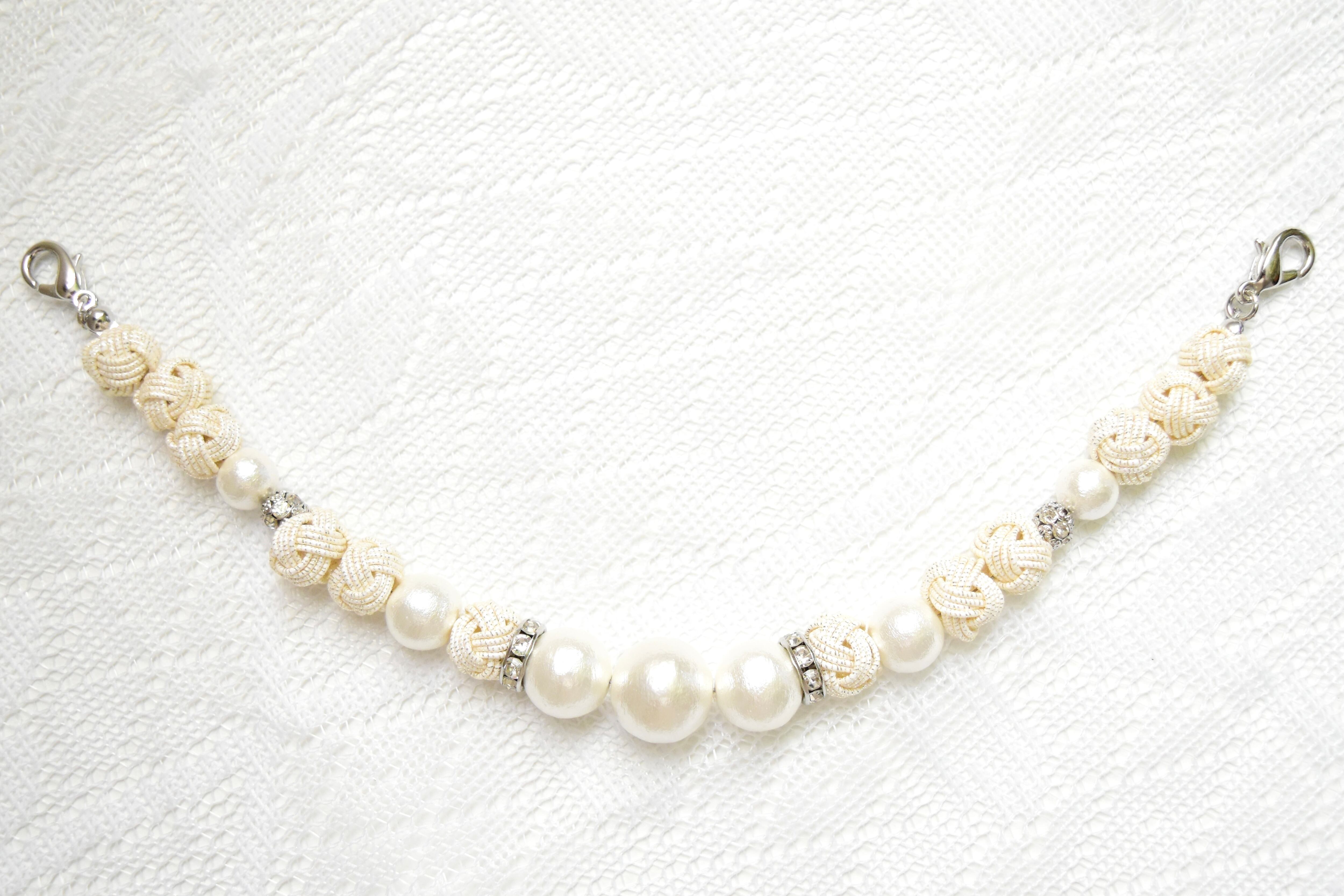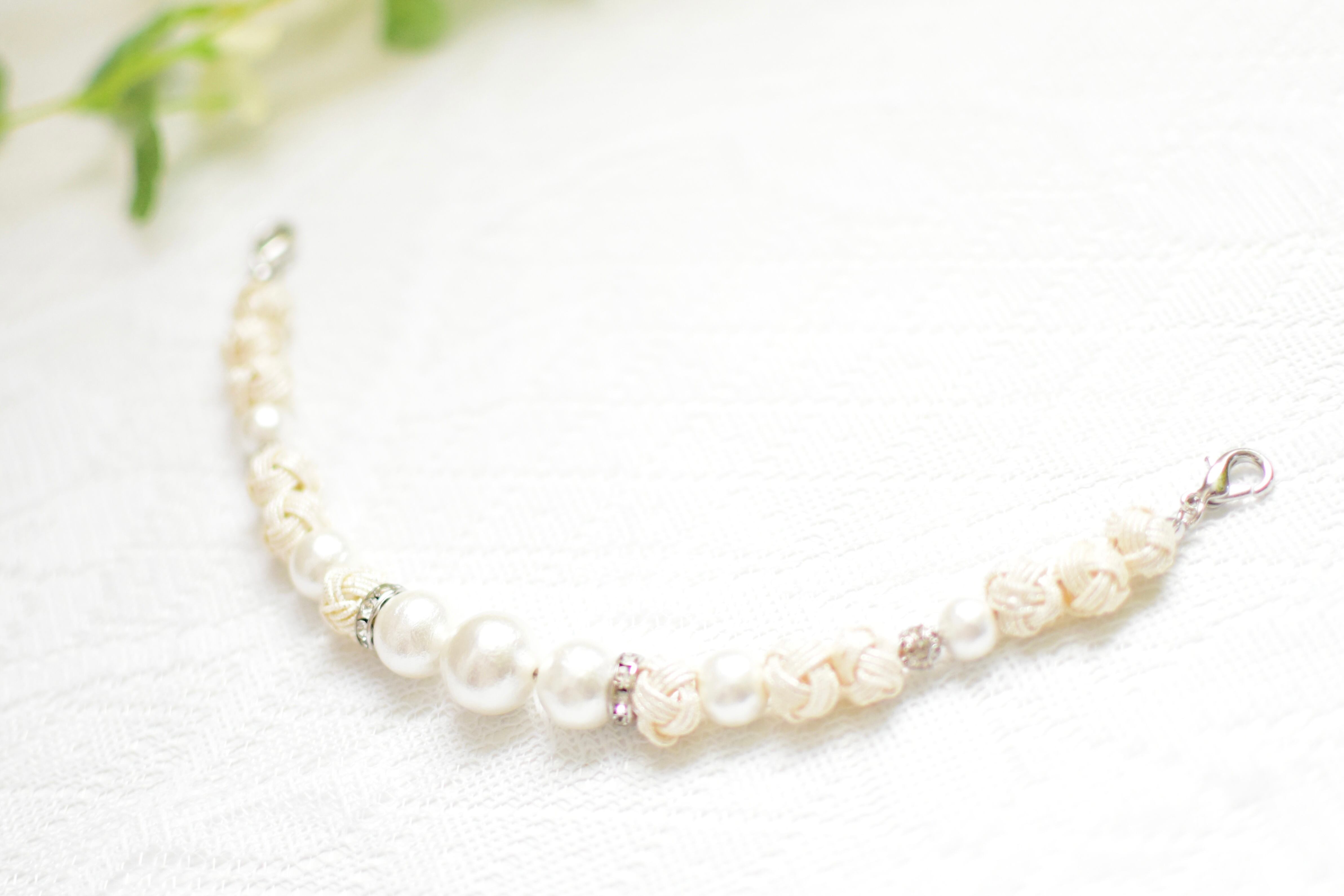 一点一点手作りで仕上げた水引とコットンパールを使用した、オリジナル羽織紐「無垢-Muku-」。その名の通り純粋無垢な美しさを追求したデザインです。